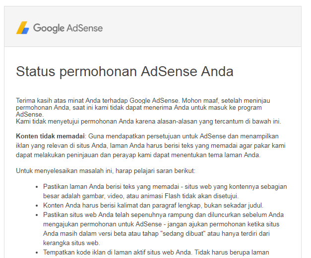 Setelah saya menunggu 3 bulan kalau tidak salah, akhirnya saya mendapatkan email dari Google Adsense yang mengatakan bahkan blog saya ditolak karena KONTEN TIDAK MEMADAI.